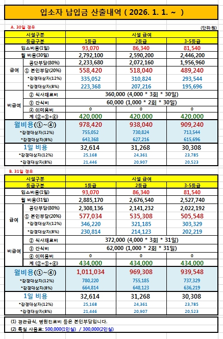 => 급여는 보건복지부 발표로 수가 계산 => 비급여(식대) : 식대 1식 4,300원 => 4,000원으로, 간식 1회 1,600원 => 2회 2,000원 으로 변경 *30일 기준 비급여 : 25년 435,000원 => 26년 420,000원
