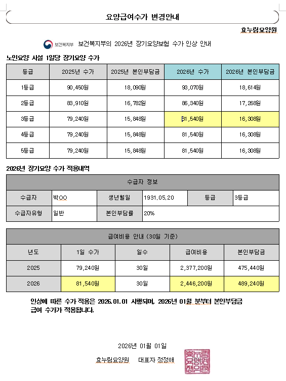 알려드립니다. 26년도 본인부담금이 아래와 같이 변경되었습니다. 26년 장기요양 시설급여비용 본인부담금 안내 - 206년도 장기요양보험료율 0.9448% 인상 - 보건복지부 발표 26년도 시설 장기요양급여비용 2.9% 인상 => 보험료율 인상을 바탕으로 복지부는 2026년도에 더 많으 어르신에게 질 높은 서비스 제공 => 수급자 보장성 강화 & 종사자 처우개선 & 통합돌봄 관련 장기요양 인프라 확대